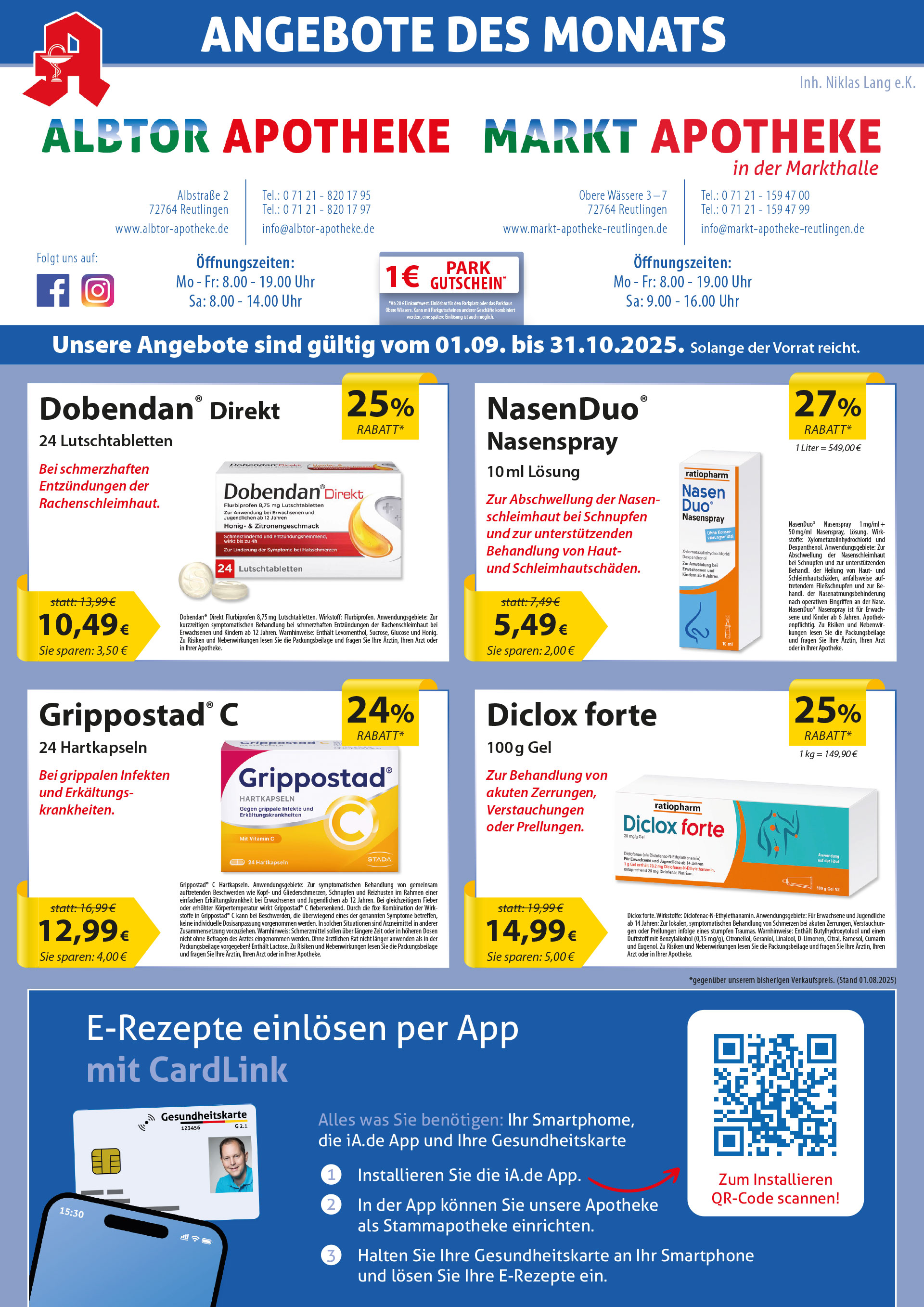 Beste Versorgung vor Ort im Herzen von Reutlingen! Seit vielen Jahren steht das Team der Albtor Apotheke für kompetente Versorgung und einfühlsame Beratung. Wir legen großen Wert darauf, Sie ausführlich, pharmazeutisch fundiert und vor allem verständlich zu beraten – in einer vertrauensvollen Atmosphäre, in der Sie sich wohlfühlen können.